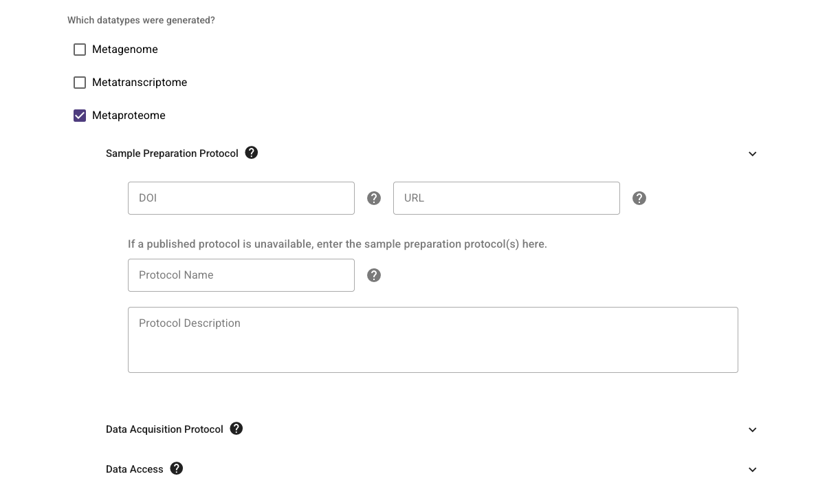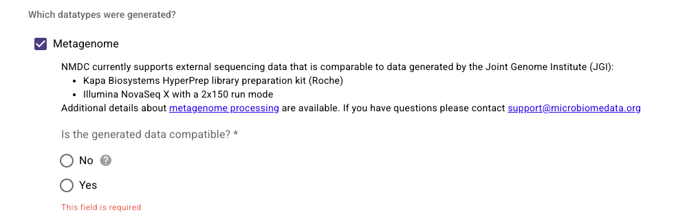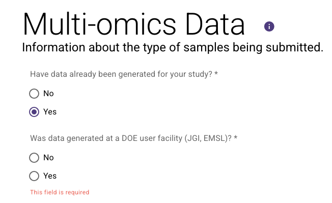 To share retrospective data and metadata that was not generated at a DOE User Facility, you will be prompted to answer questions about how your -omics data was generated. This provides the information necessary to determine if your data can be analyzed via NMDC workflows.