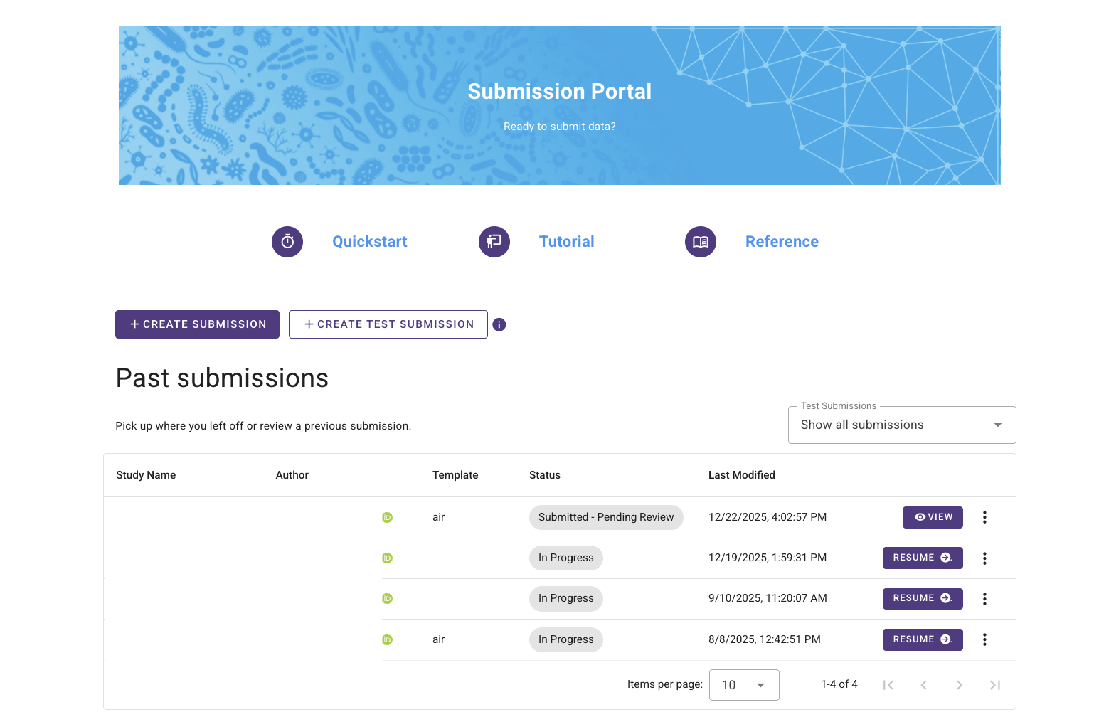 For new studies, you can either create a 'Submission' or a 'Test Submission'. Creating a 'Test Submission' is available to test and experiment with the NMDC Submission Portal. Test submissions cannot be submitted or changed to a real submission. Any sample metadata entered in a test submission can be exported, and imported into a real submission. See download and import below. Details on creating a "New Submission" are also outlined below.